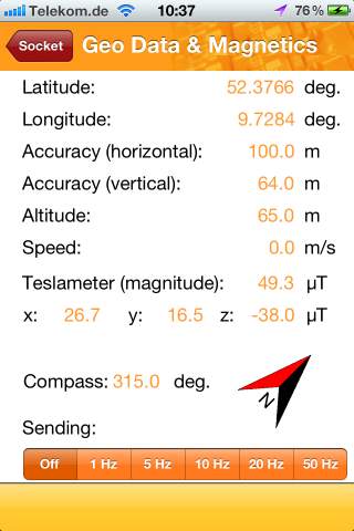 To stream data from positioning system, Teslameter and Compass from your iOS or Android device to your device just select the frequency for sending.