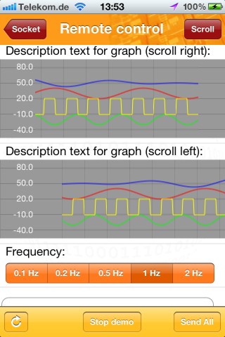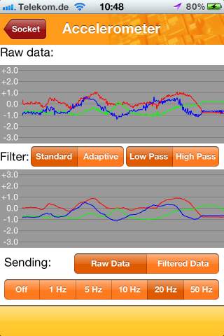 To stream data from 3 axis accelerometer from your iOS or Android device to your device just select the frequency for sending. You can get raw data directly from accelerometer or filter them before sending. Use the filter settings that are usefull for your