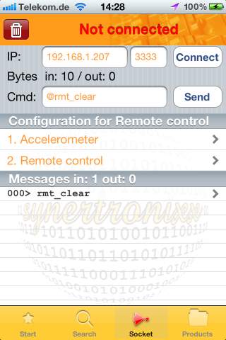 To test a command you can also directly edit it. Go to the "socket" tab and add '@' before the command and press "Send" button. Commands that starts with '@' are not transmitted to your device!! The '@' will be removed and the command will be processed like a command that has been received via socket.