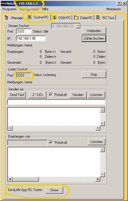 Start "DeviLAN App" and go to tab "Socket"
