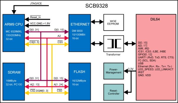 Die Lösung dieses Problems ist der Einsatz von modularen ARM9 Socket Computern SCB9328, da die Integration von Komponenten im µBGA-Gehäuse und der Einsatz von Fine-Pitch Multilayerleiterplatten in ein flexibel einsetzbares Modul weggekapselt wird. Auf Basis des Freescale™ Controllers i.MXL beinhaltet der SCB9328 eine mit 200MHz getaktete 32-Bit